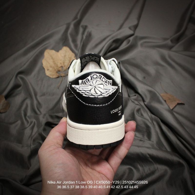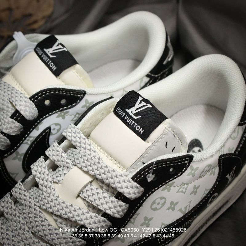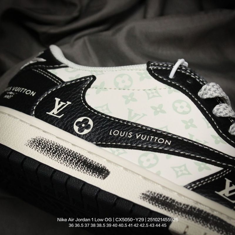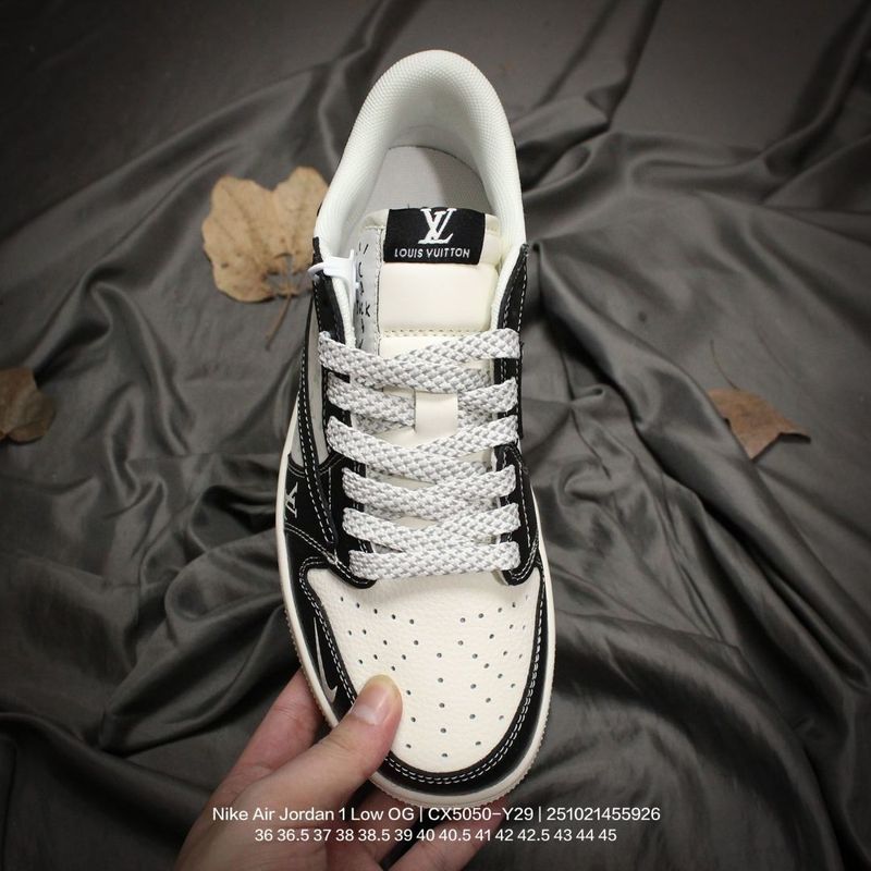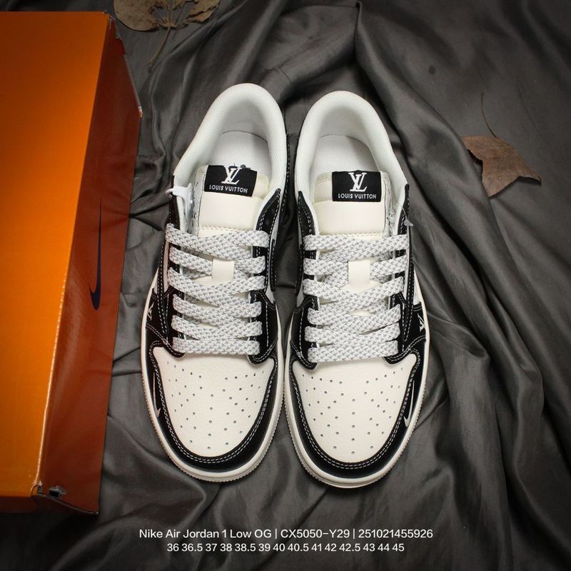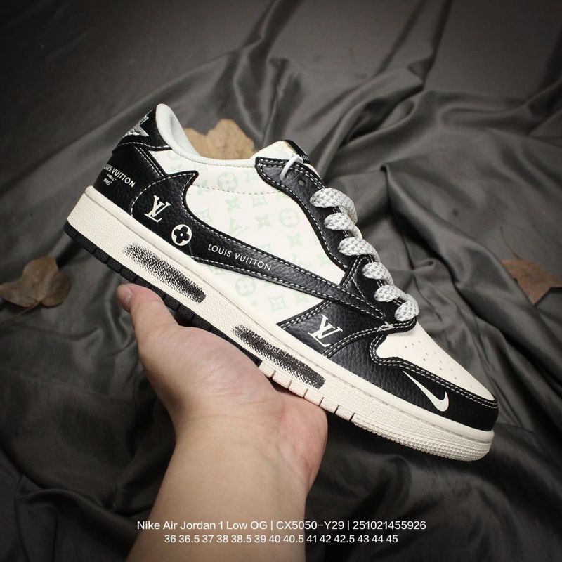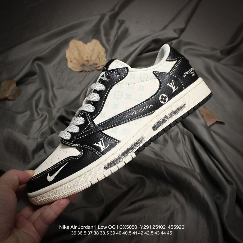 Jordan men’s and women’s shoes, authentic label, half-size system, featuring a soft pebbled leather upper, meticulously reinforced midsole, EVA cushioning insole with adhesive backing, built-in air unit, and durable rubber outsole! A custom collaboration between popular hip-hop artist Travis Scott and the top French luxury brand Louis Vuitton x Travis Scott x Nike Air Jordan 1 Low OG SP “Beige/Black/LVMonogram” AJ1 classic low-top basketball shoe “CX5050-Y29” Type: Men’s and Women’s Shoes Sizes: 36 36.5 37 38 38.5 39 40 40.5 41 42 42.5 43 44 45
