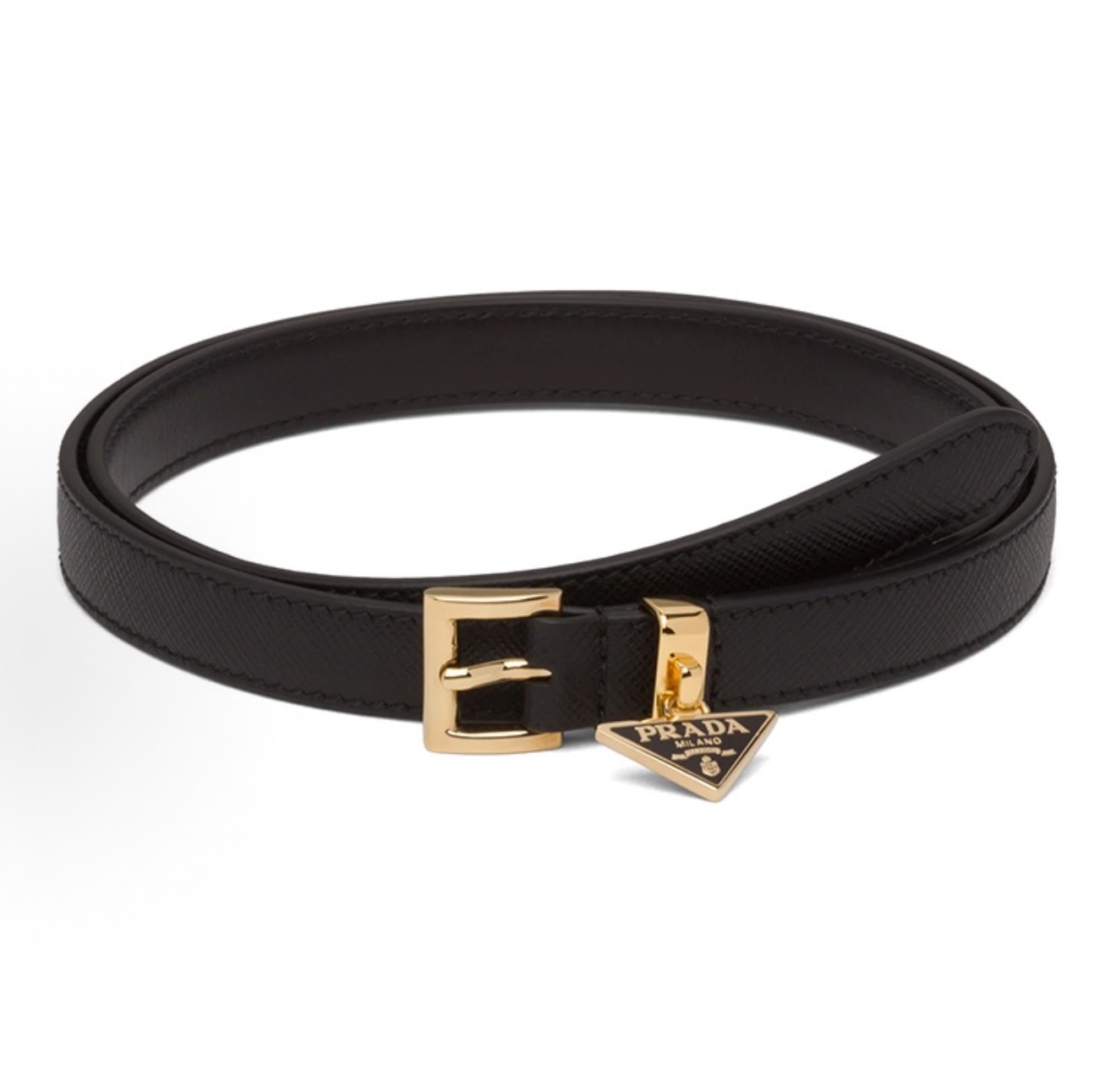 The polished gold-toned buckle features Prada’s legendary triangle logo, a symbol of the brand’s legacy since 1913. The bold, geometric design combines black enamel with gold metal, creating a striking focal point that is both modern and instantly recognizable.